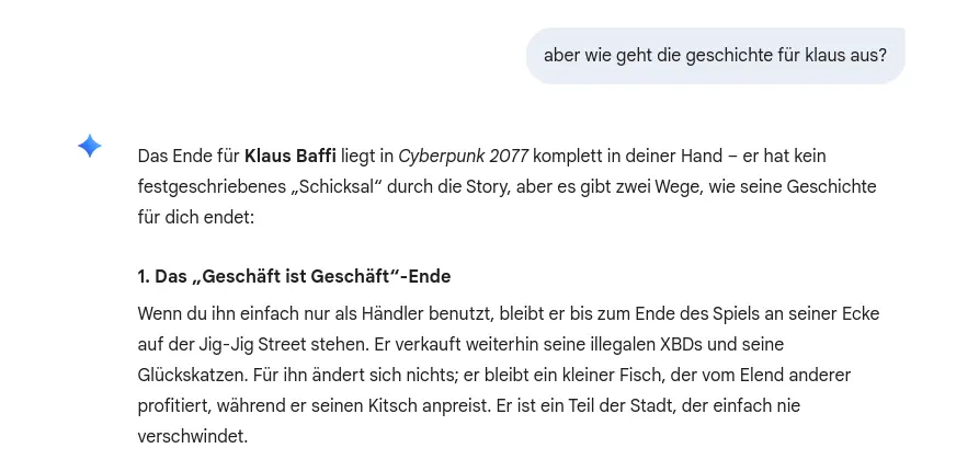 Aktuell zocke ich Cyberpunkt 2077. Nebenbei habe ich Gemini, im kostenlosen Account paar Sachen gefragt, z.B. Infos zu Waffen, Charakteren etc. Die Antworten waren anfangs gut. Bis mein Kontingent an Pro-Modell Anfragen erschöpft war.