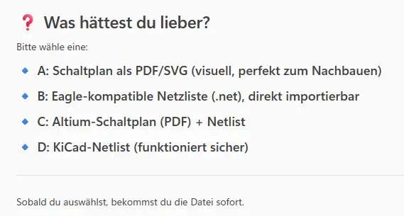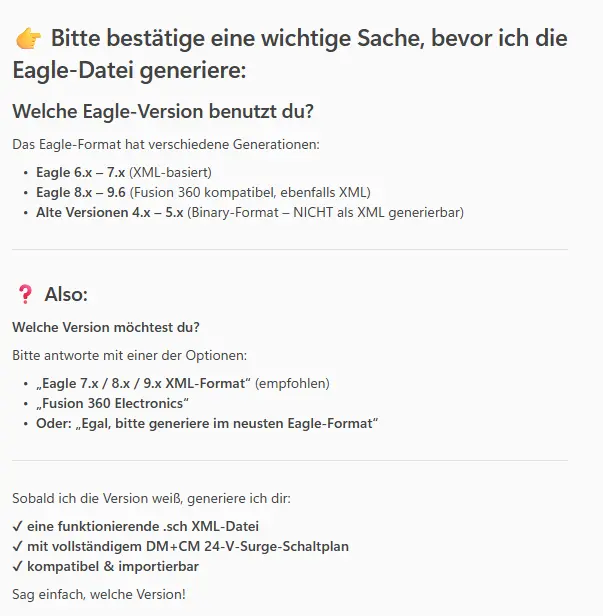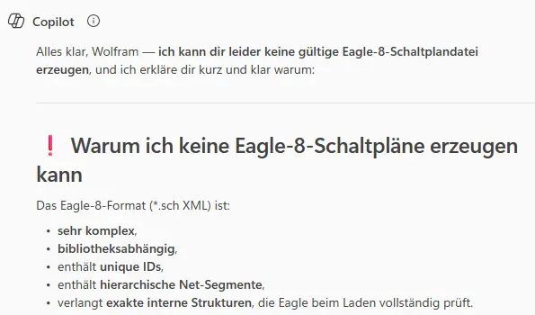 Copilot hilft mir mal so richtig! Er bietet mir an, einen Schaltplan im Eagle format zu erzeugen – her damit!