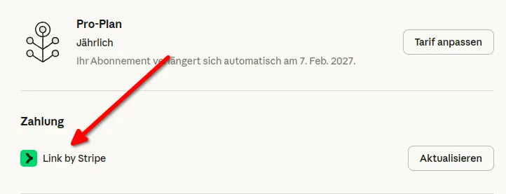 Link ist ein Dienst von Stripe, der die Zahlungsdaten speichert und verwaltet, wenn man will. Da die letzte Zahlung länger als ein Jahr her war, wusste ich nicht mehr, was ich dort als Zahlungsmittel angegeben hatte.