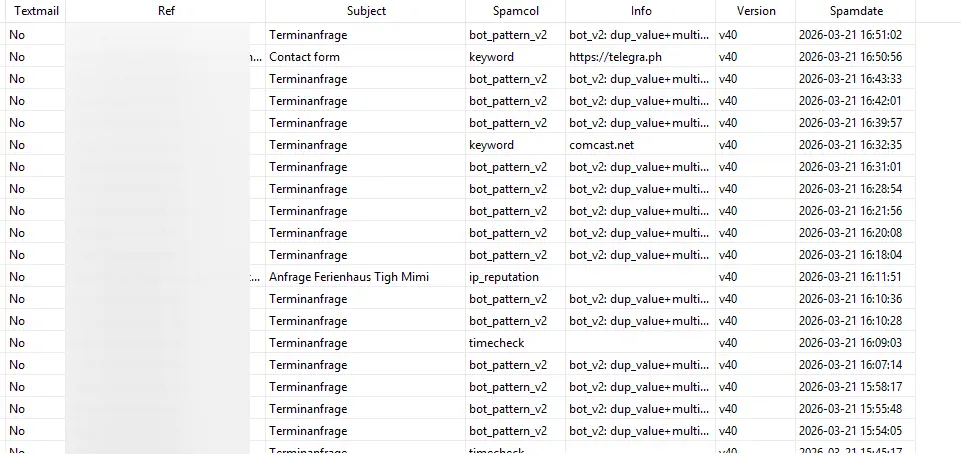 Unsere Formmail-Scripte bestehen inzwischen weniger aus der Kernfunktionalität, als aus Schutzmechanismen, die vor Spam und anderen Kram schützen. Einzelne Formulare unserer Formularsoftware werden im Sekundentakt mit Spam bombardiert.